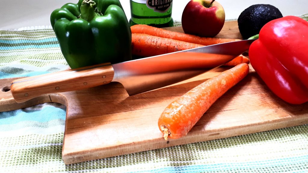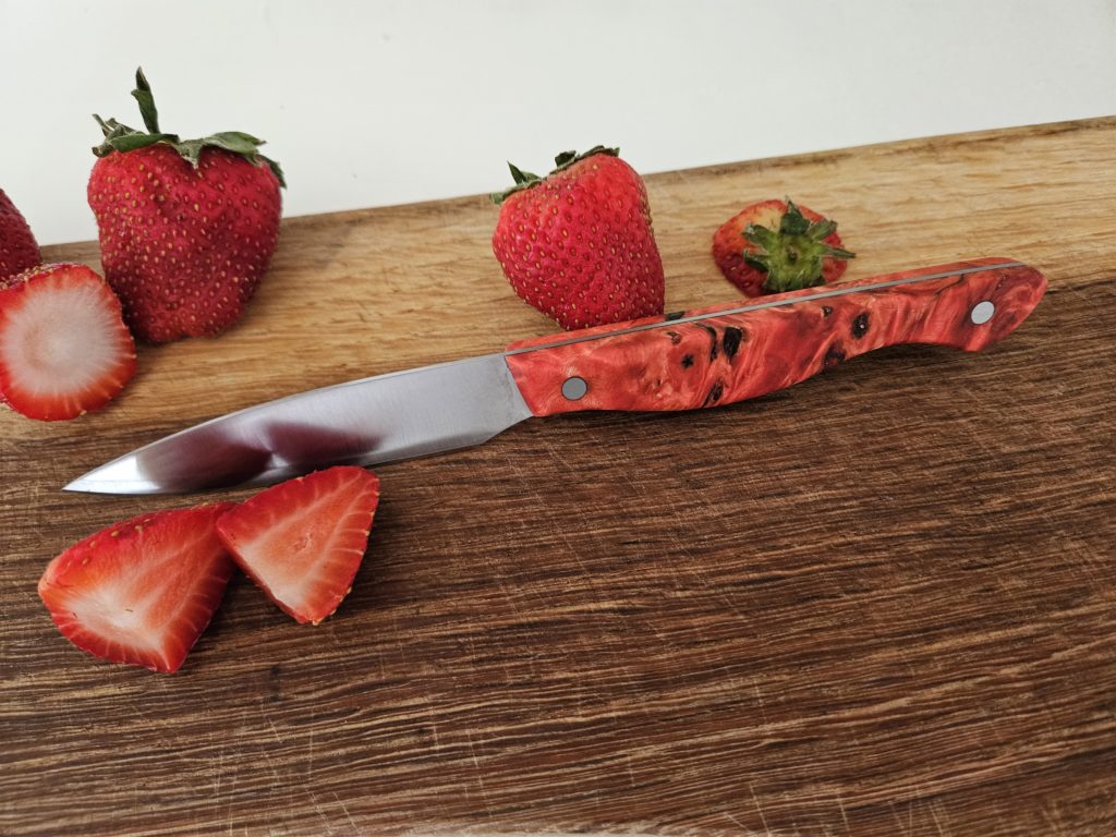 I use 440c exclusively for my kitchen and cheese knives – well, almost exclusively. I’ve made a few exceptions for artistic purposes, but when I do that it will be clearly noted so you always know exactly what you are getting. 440c is a high-carbon stainless steel, which gives you the best of both worlds: the tough edge holding ability of high-carbon, and the stain resistant qualities of stainless steel which most people prefer in their cutlery. This makes 440c an excellent steel for kitchen knives.