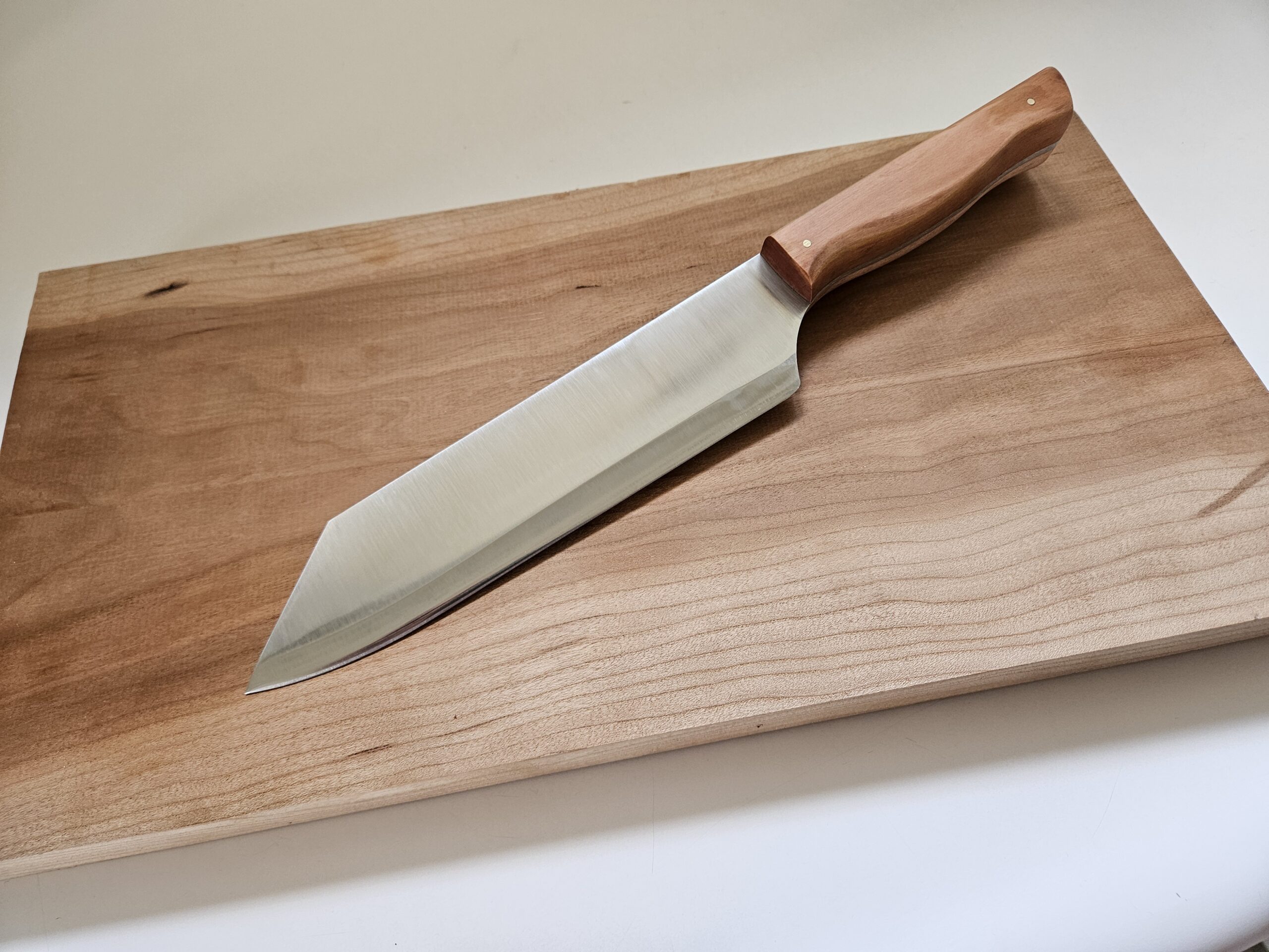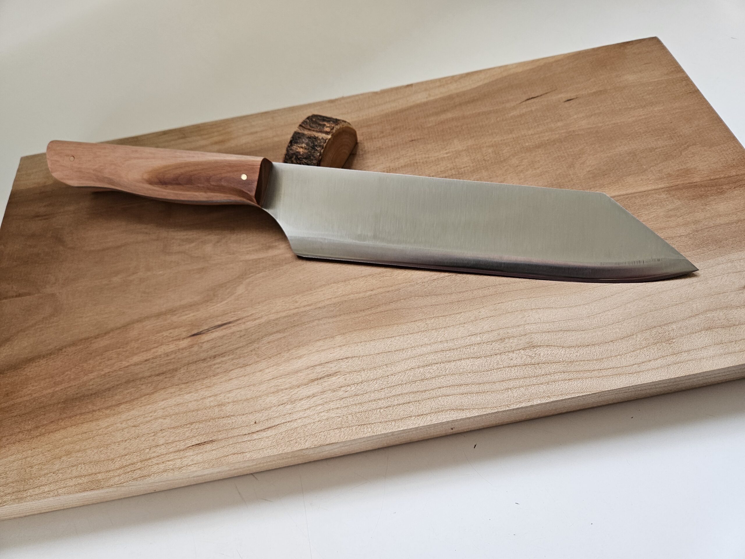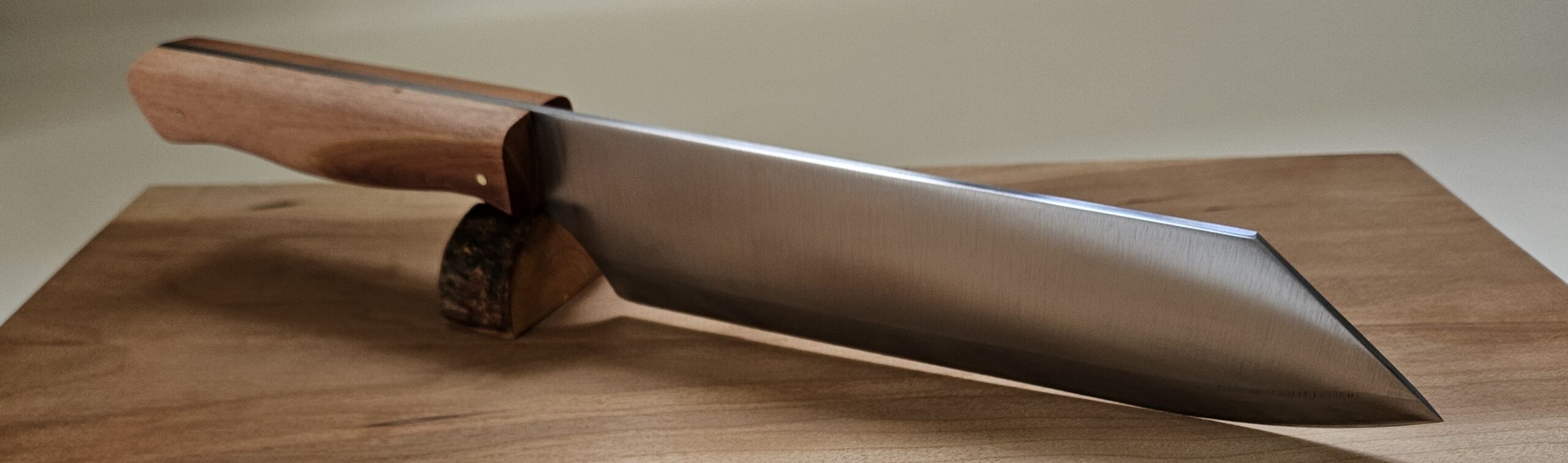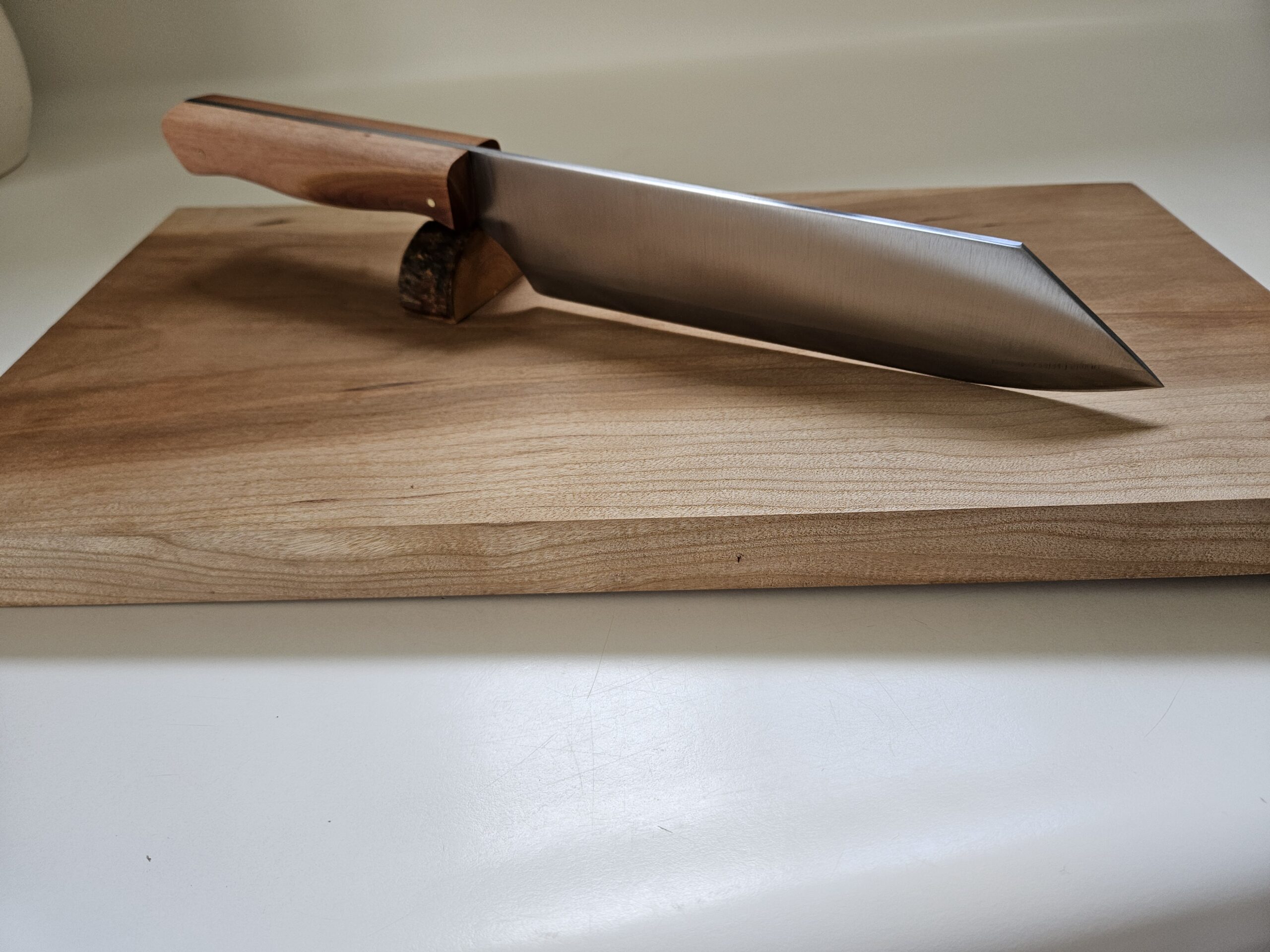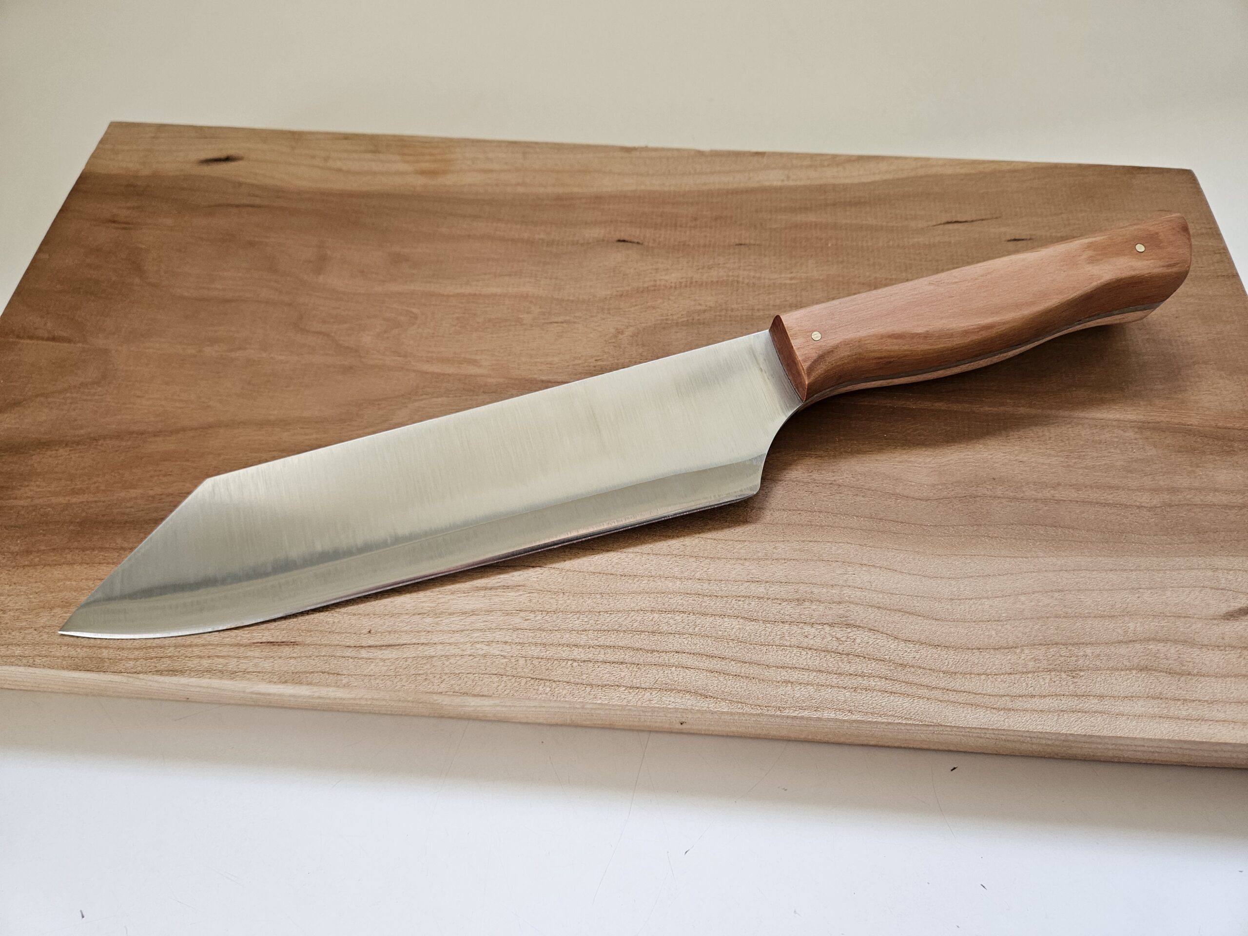 The large full-tang handle is made from a gorgeous Mountain Mahogany hardwood. The pins are solid brass.