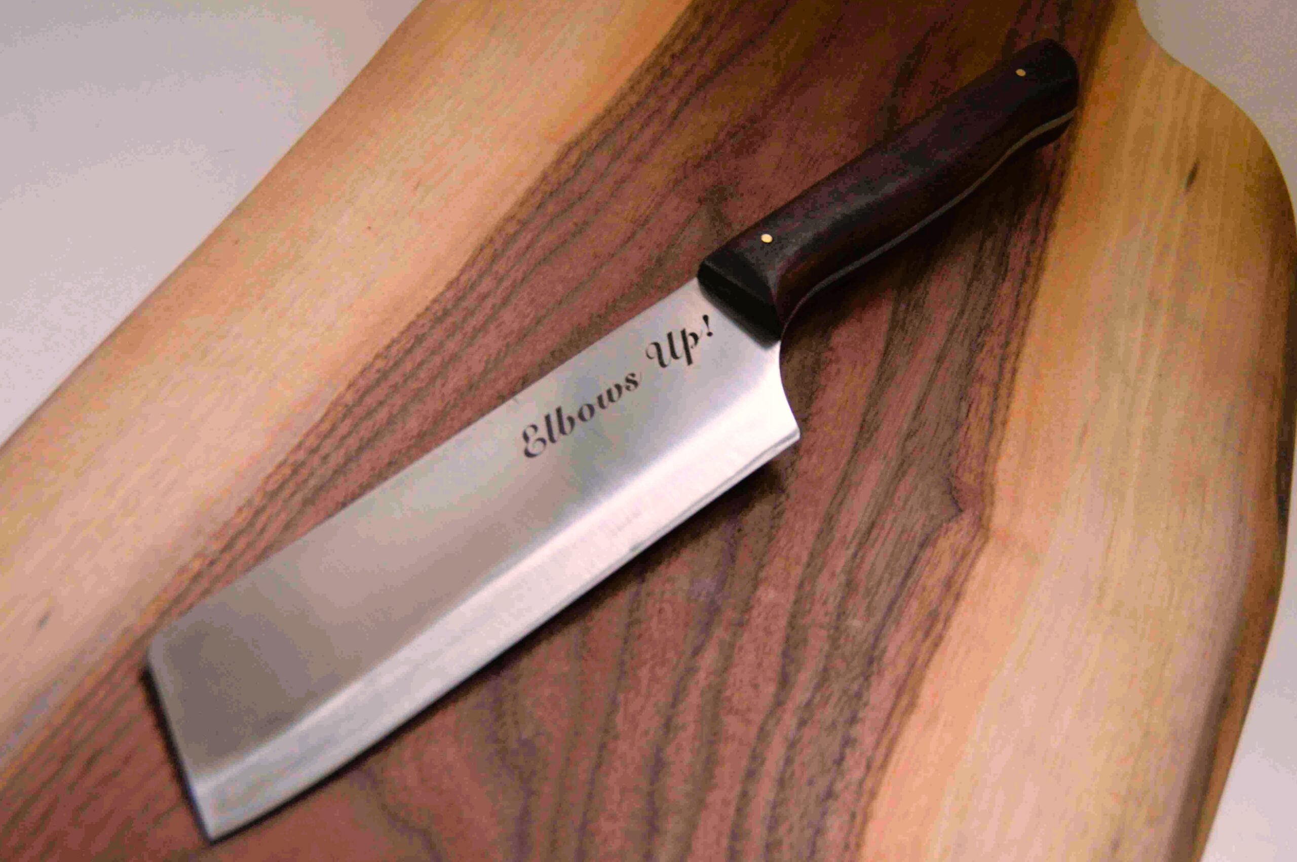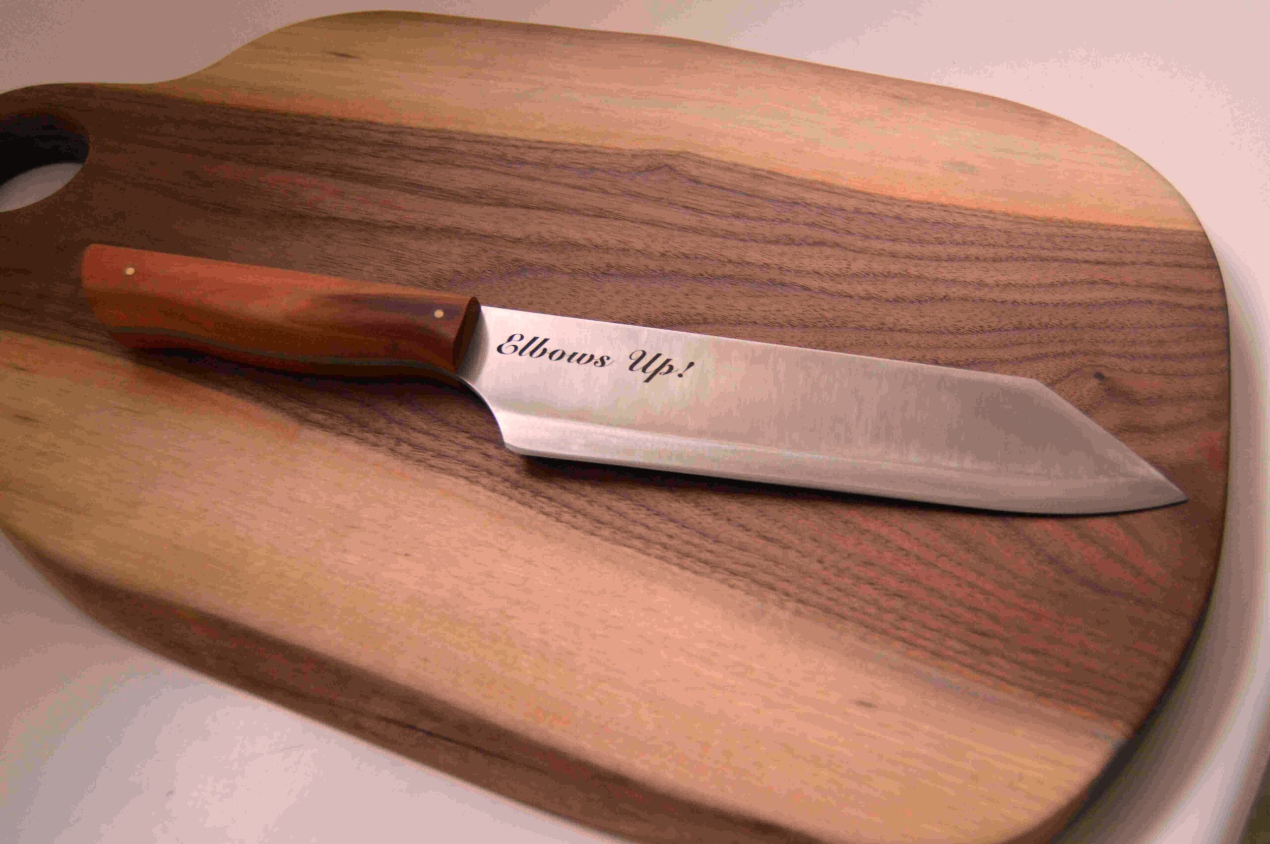 In todays post I’m featuring a couple of my handmade BBQ knives and kitchen choppers that I’ve had engraved with Elbows Up!