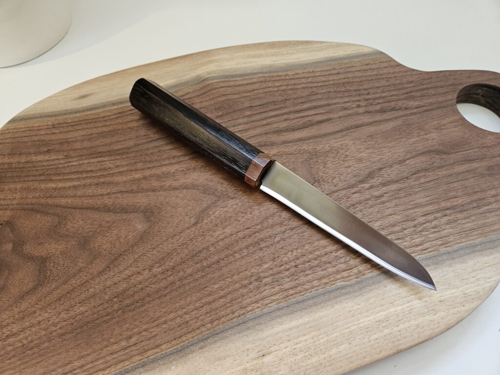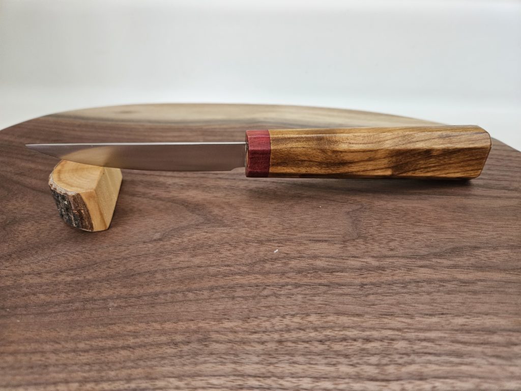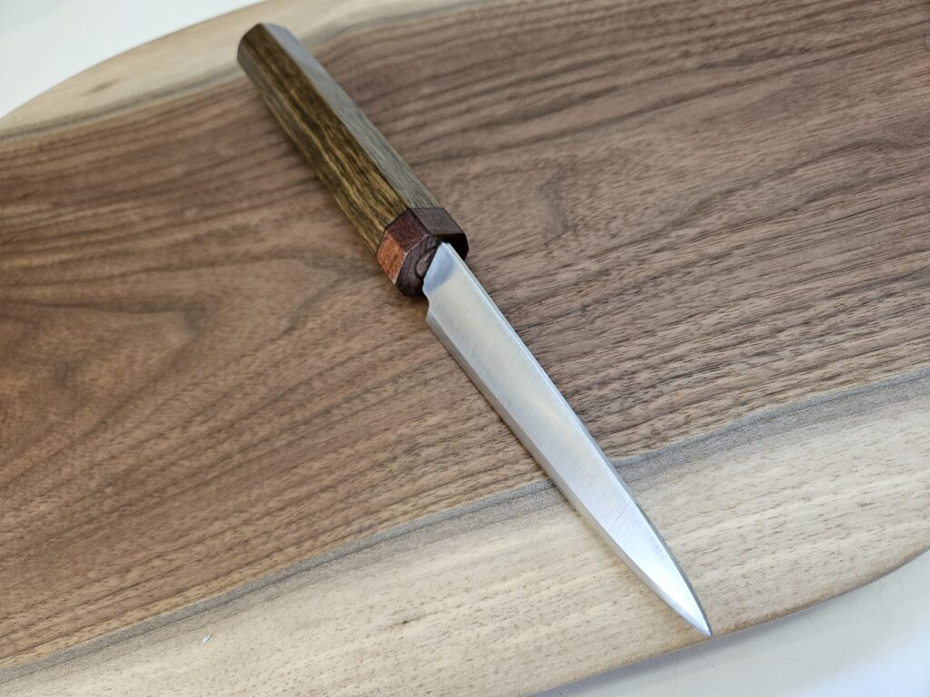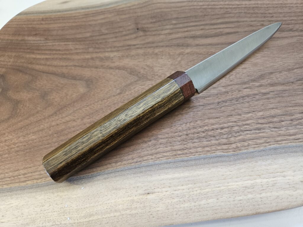 In today’s blog I’d like to feature a few petty (paring) knives I’ve recently made with Wa handles using various exotic hardwoods. These handles are very light and comfortable to hold.