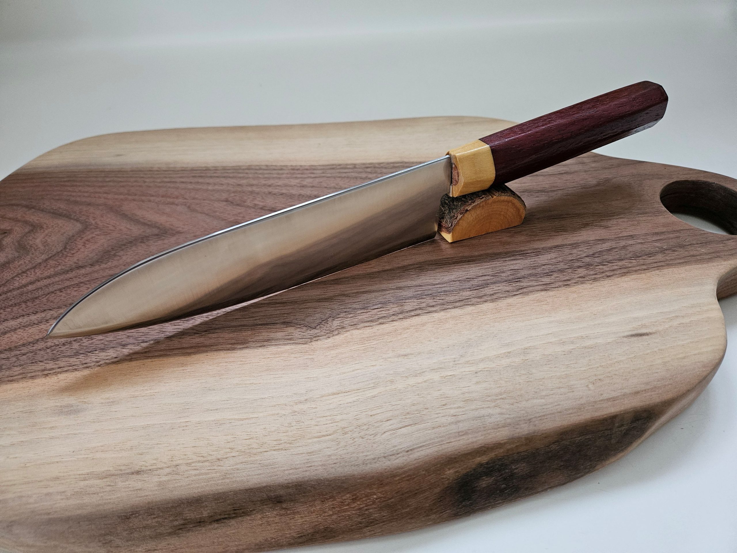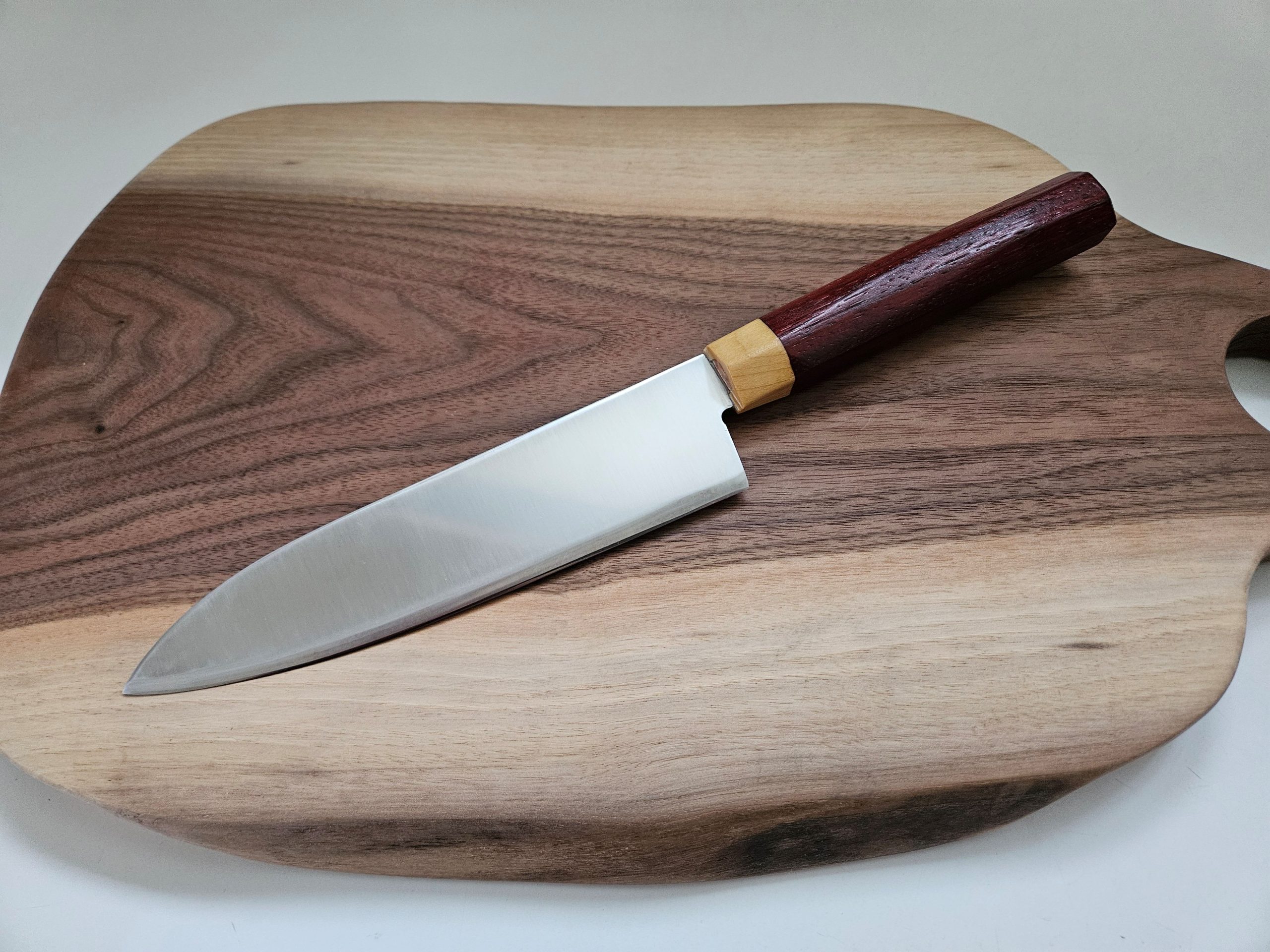 The dark hardwood handle is made from Padauk wood. All Padauks are African or Asian in origin. The light bolster is birch. The handle style is Japanese Wa.