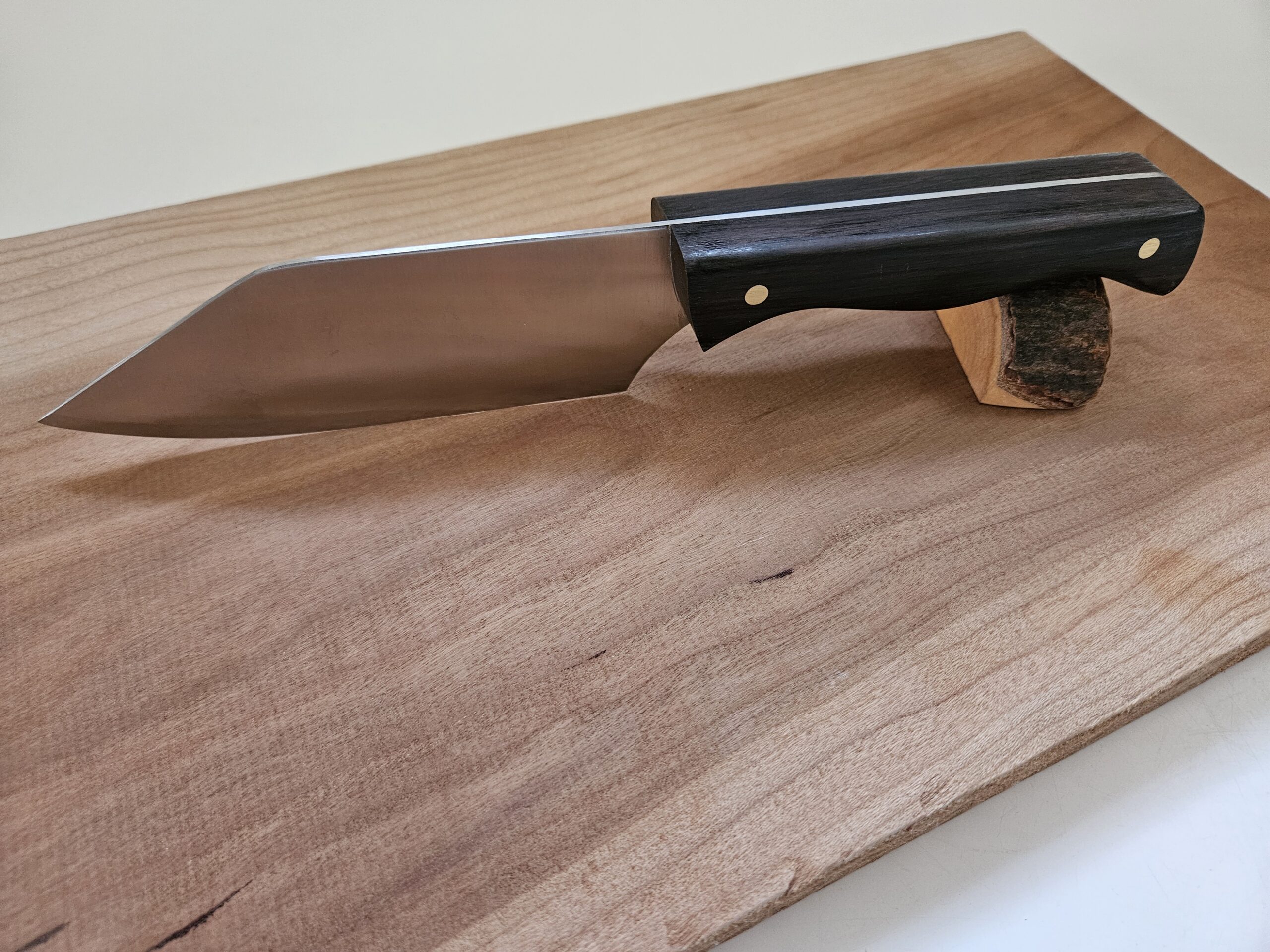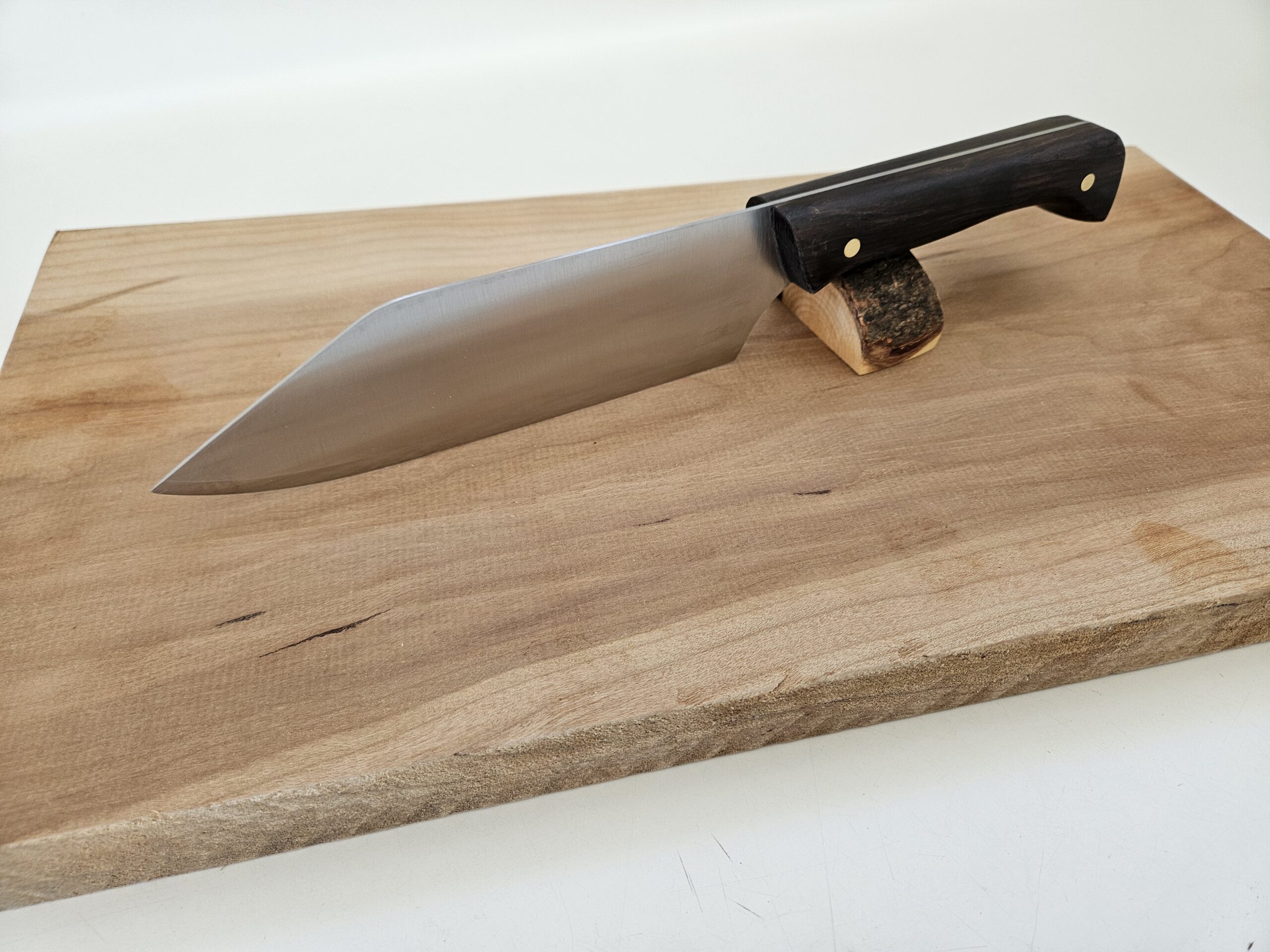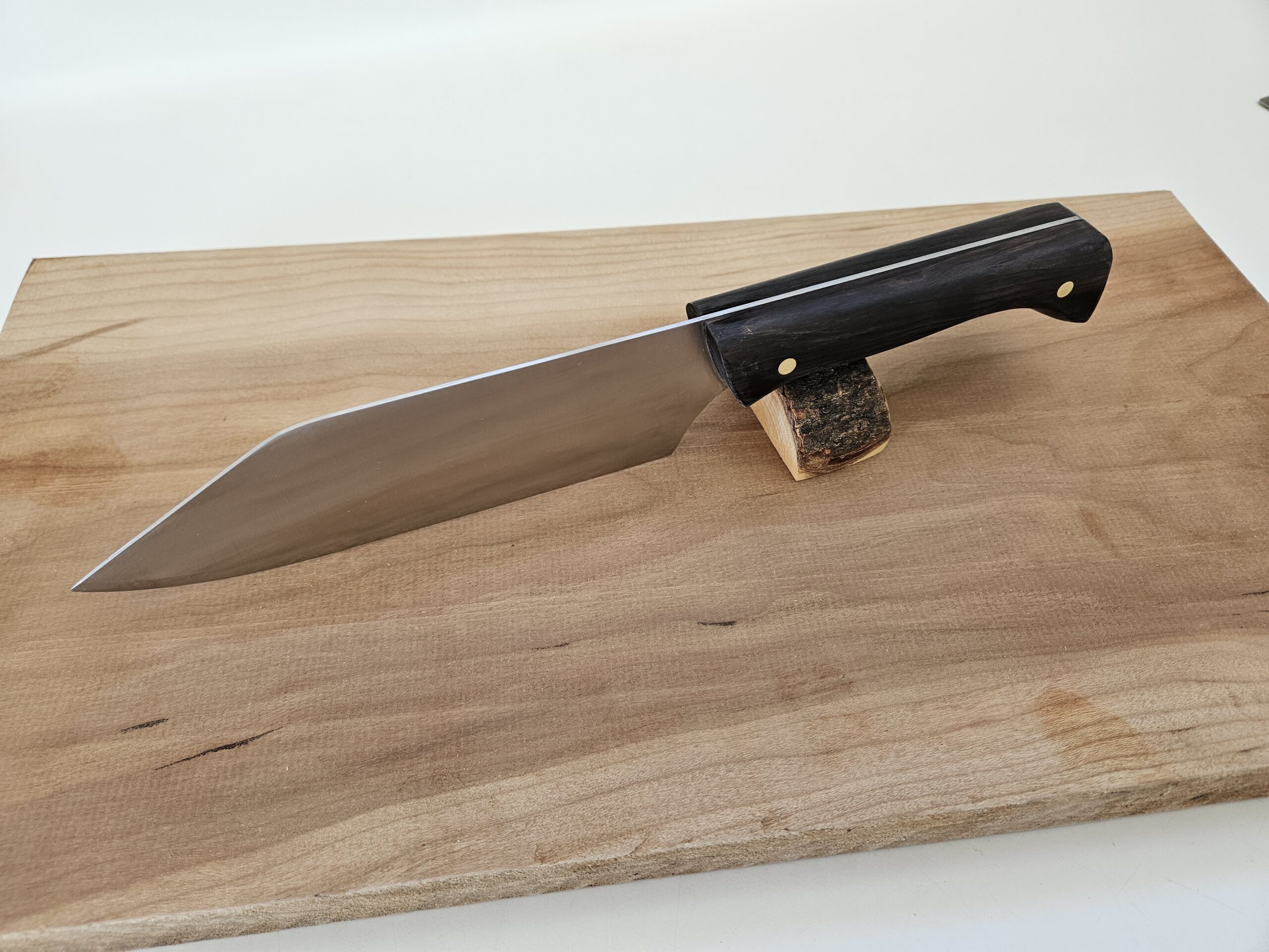 Wide blade stainless steel Chef’s knife with a dark rich African Blackwood handle.