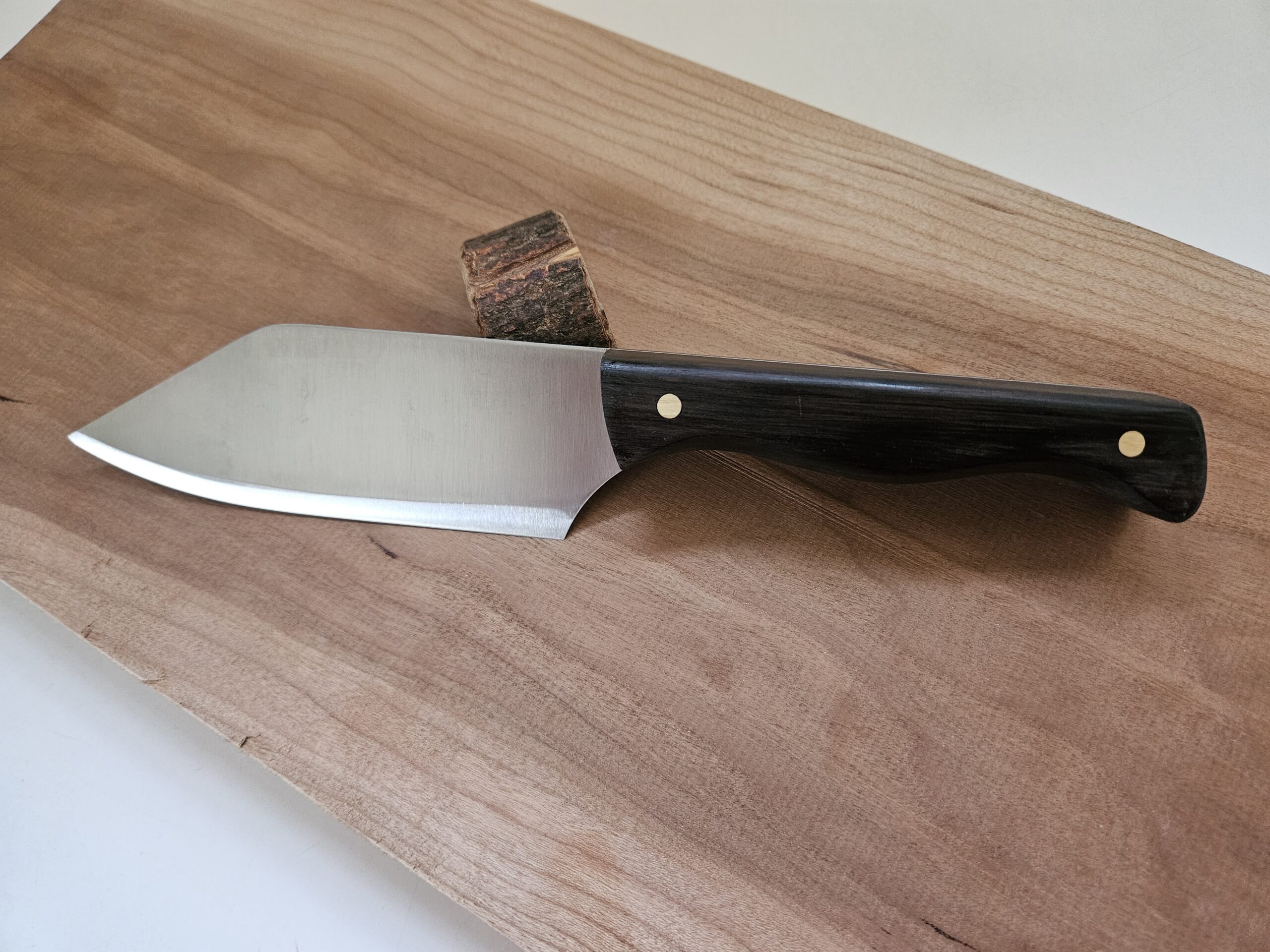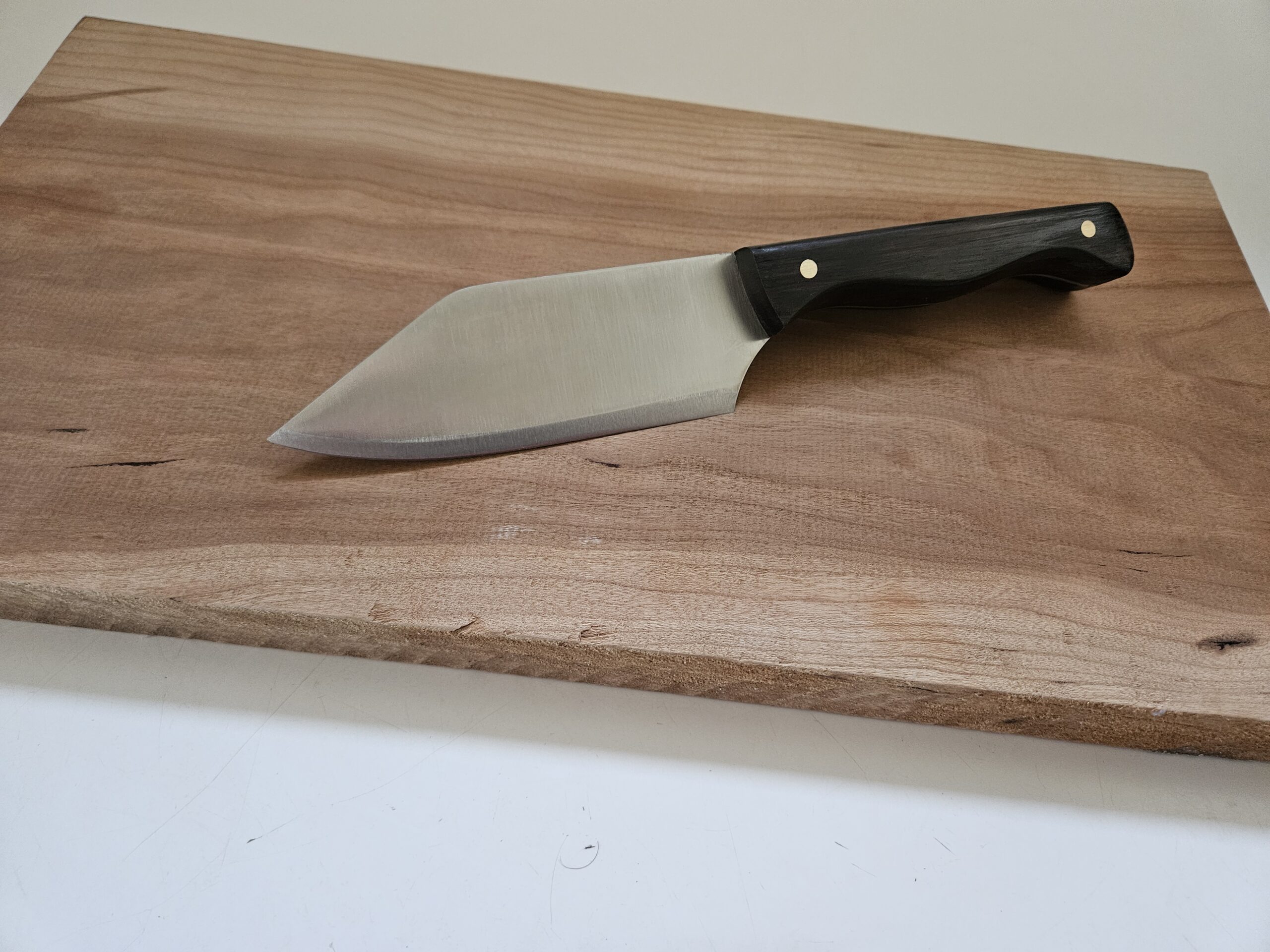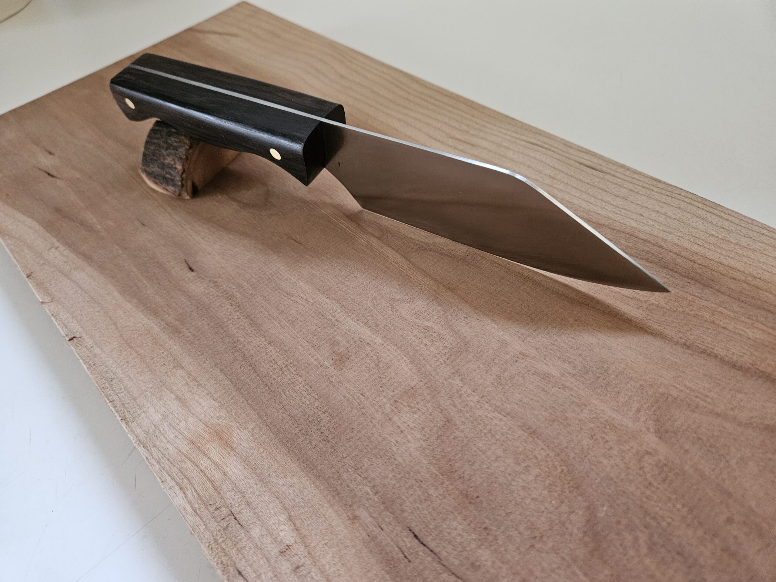Wide blade stainless steel Chef’s knife with a dark rich African Blackwood handle.